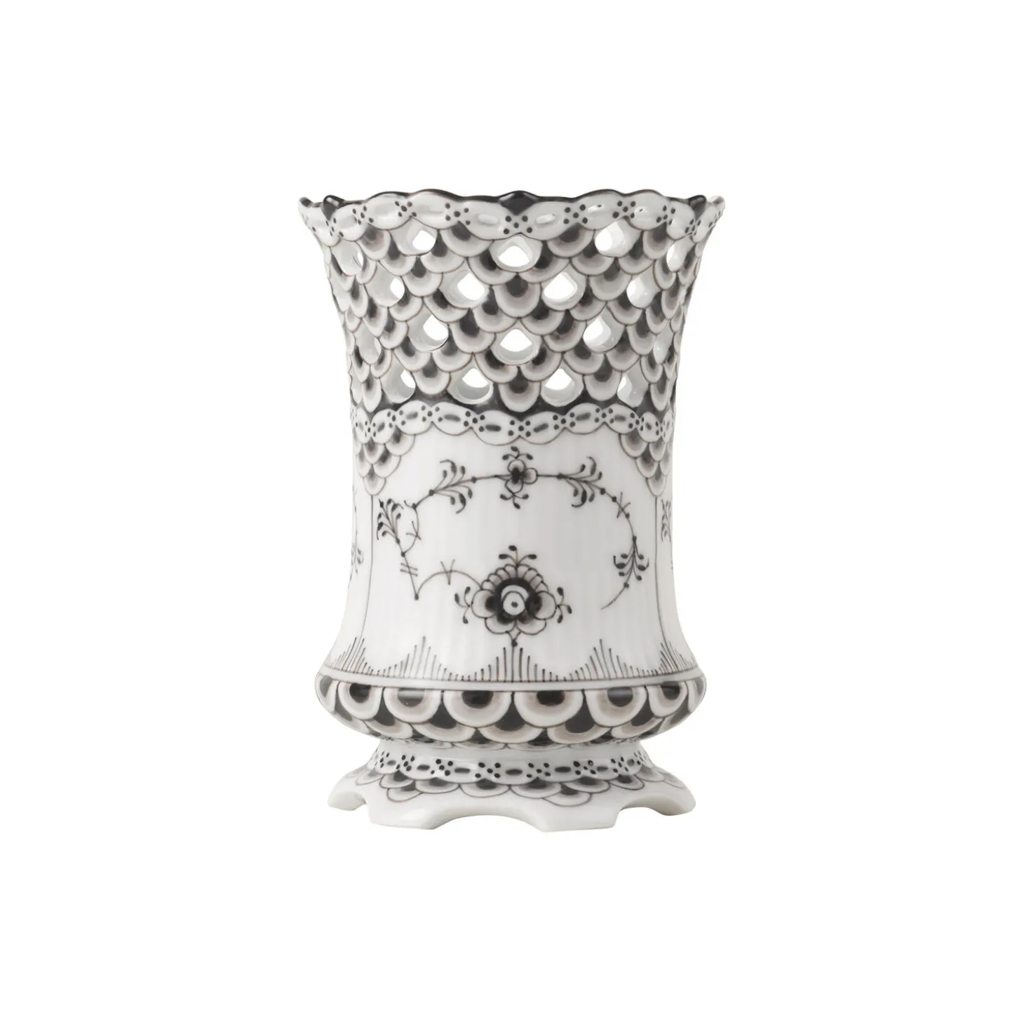 Den mindste af to Sort Musselmalet Helblonde vaser illustrerer det fineste inden for porcelænshåndværket i både den høje detaljegrad i modelleringen og bemalingen med den svære, sorte farve. Vasen danner smukt centrum på middagsbordet og er en oplagt gaveide til en helt særlig person.