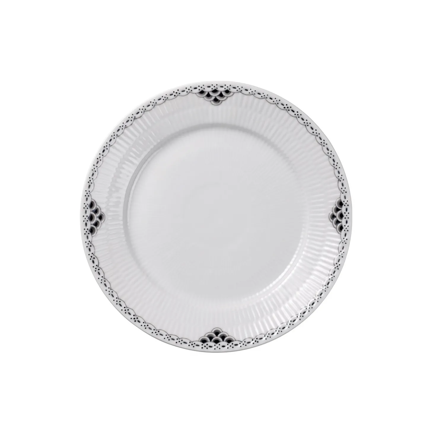 Den Sort Riflet Blonde Tallerken viser skønheden i enkelhed. En hvid riflet tallerken med sarte sorte dekorationer, der yndefuldt løfter blondedetaljerne på kanten. Tallerkenen på 22 cm er et glimrende valg til frokost eller morgenmad.