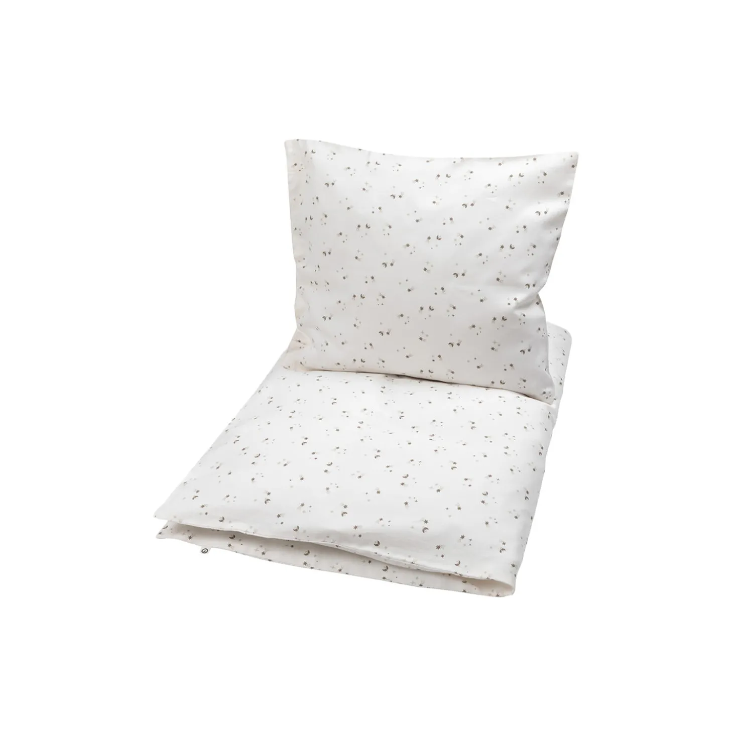 Lækkert blødt sengetøj i blød vævet økologisk bomulds satin Trykknap lukning på både pude og dyne. Dyne mål: 100×140 cm. Pude mål: 40×45 cm. Pakket i en stofbærepose. 100% vævet bomulds satin (GOTS Organic Certified by Ecocert Greenlife Lic. No. 151714). Produktet er GOTS organic- certificeret, hvilket betyder at bomulden er certificeret økologisk, og at der i alle andre processer som farvning, strikning og syning er taget de strengeste hensyn til miljøet. GOTS er internationalt anerkendt som den førende standard for forarbejdning af tekstiler af økologisk bomuld. Derudover tages der også hensyn til arbejdsforholdene, hos dem der producerer tøjet. Økologisk bomuld 100%