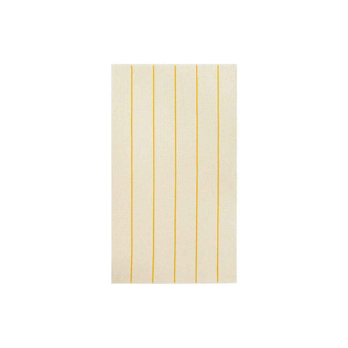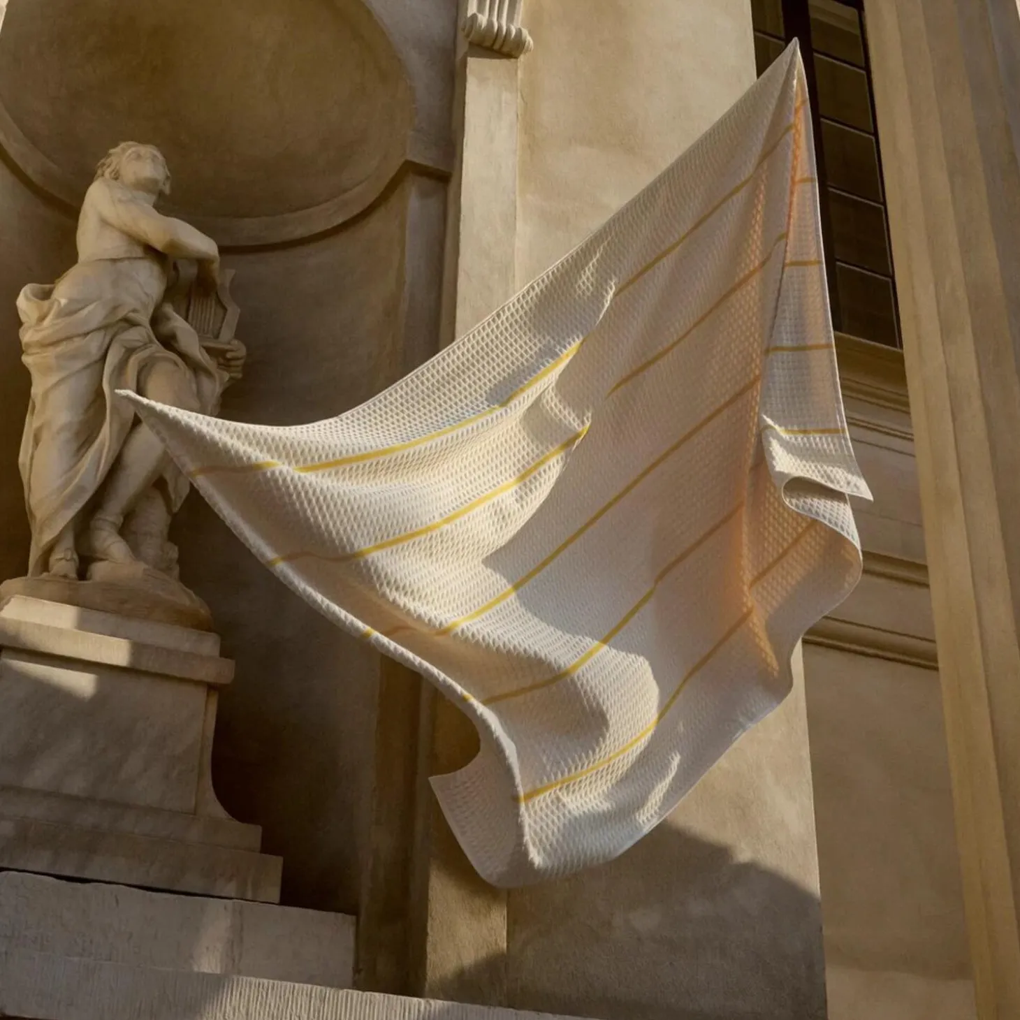 Georg Jensen Damasks elegante Speciel Edition strandhåndklæde er skabt med udgangspunkt i det ikoniske facetmønster, hvor designer og væver Jette Nevers har udnyttet jacqardvævningen til at skabe et elegant skyggespil i mønsterets sammenhængende trekanter. I Special Edition strandhåndklædet fremhæves den smukke geometri i blød velourfrotté med lodrette delinger af solsikkegule striber.