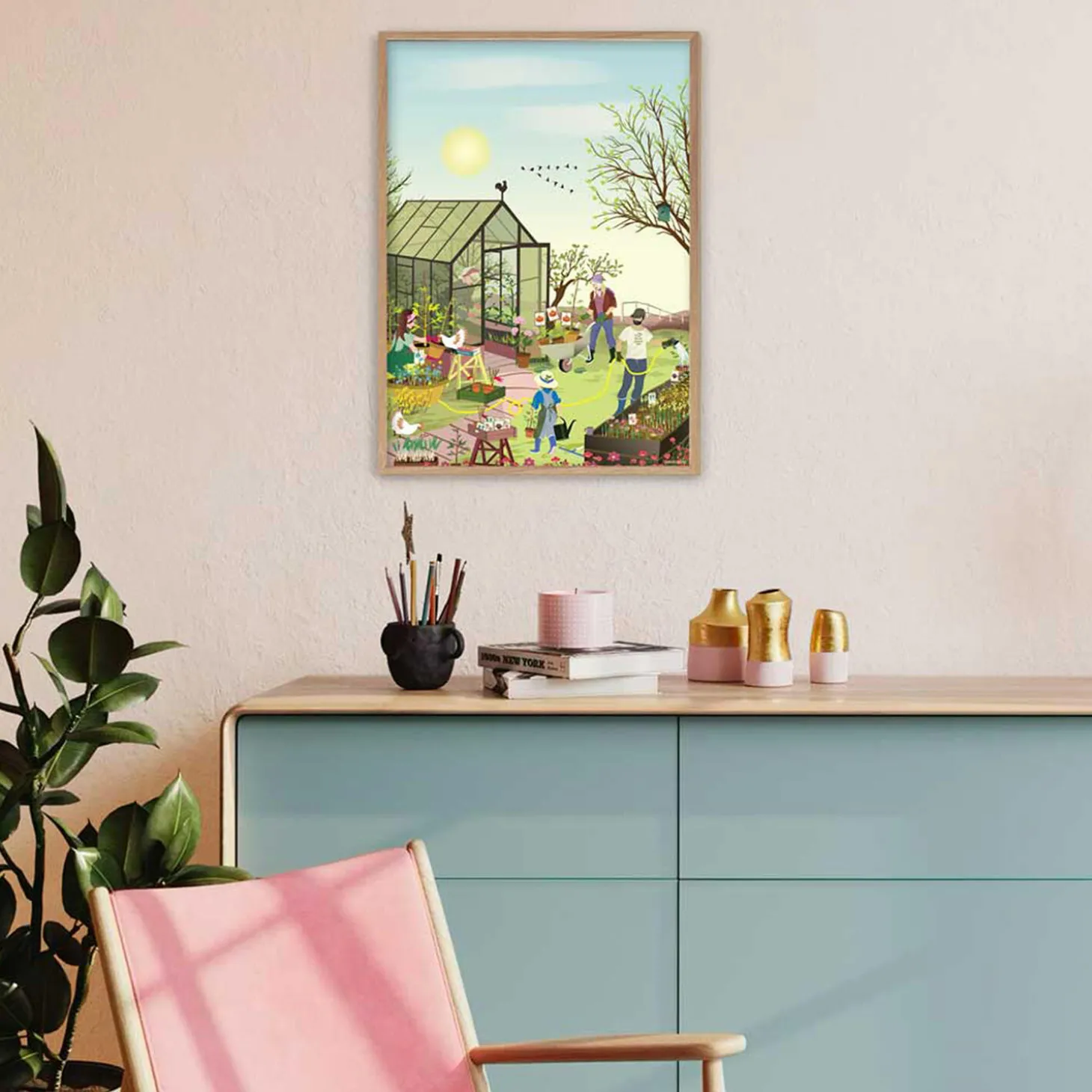 Endelig er foråret her! Naturen vågner langsomt op fra vinterens hi og springer ud i lyset. Der er meget at tage fat på i den lille have – der skal vandes, sås og luges. Hele familien er med, får jord under neglene og mærker glæden ved at være tæt på naturen. De spæde, grønne blade på træerne og svalerne, der er vendt hjem, er den fineste baggrund for denne forårsdag. Plakaterne er FSC certificeret og trykt på 170 gr. Arctic Silk papir produceret i Sverige. Produktet er produceret i Danmark.