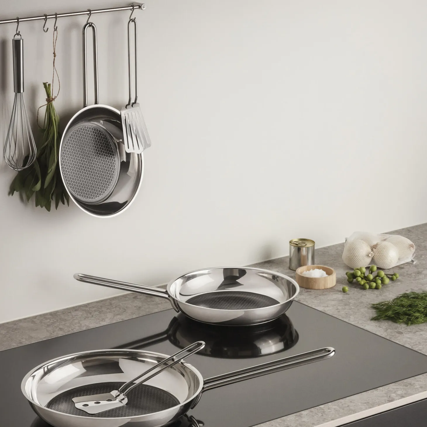Alsidig kvalitetsstegepande hvor korpus er fremstillet af 90 procent genanvendt post-consumer rustfrit stål, et materiale der er yderst slidstærkt og nemt at holde rent og pænt. Panden er belagt med en keramisk Slip-Let® belægning udført i det revolutionerende mosaikmønster. Mønsteret i overfladen består af små forhøjninger af rustfrit stål, der beskytter den keramiske Slip-Let® belægning. Designet kombinerer holdbarheden fra rustfrit stål med de praktiske egenskaber fra Slip-Let®, hvilket resulterer i en pande, der besidder fremragende slippeevne, mens den tåler brug af metalredskaber, maskinopvask og temperaturer op til 400 °C. Stegepanden er velegnet til alle varmekilder. Kan bruges på følgende varmekilder: Glaskeramisk, Elektrisk, Gas, Induktion, Ovn.