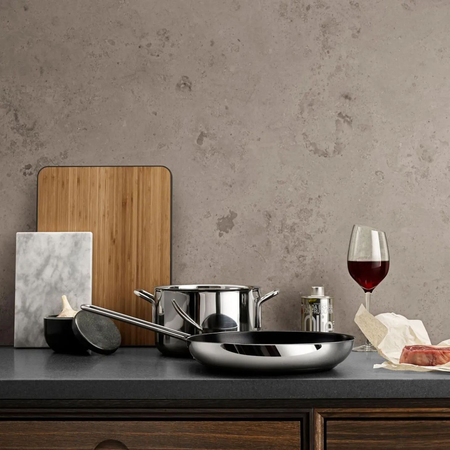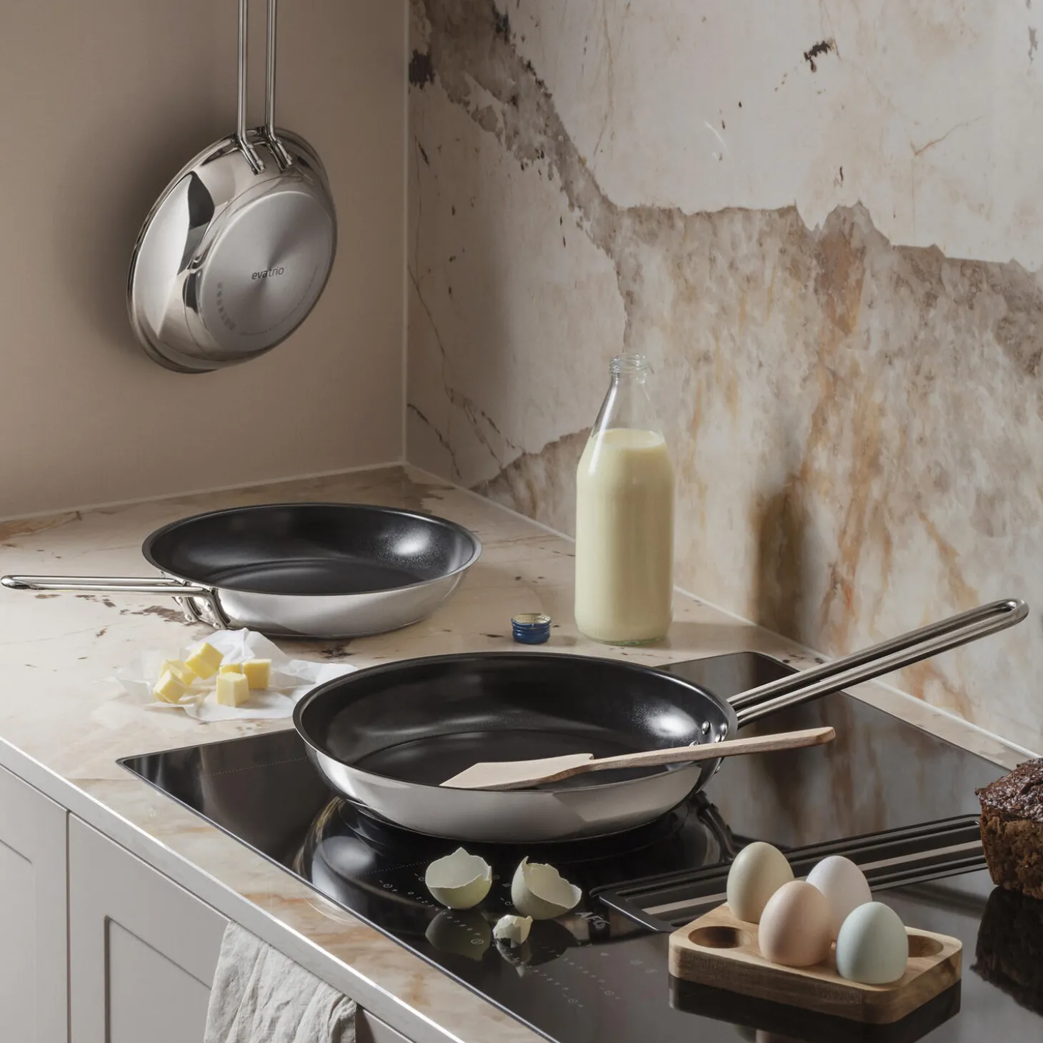 Den klassiske serie i rustfrit stål har i mange år indeholdt stegepander med og uden Slip-Let® belægning. Nu introducerer Eva Solo en stegepande i Rustfrit stål-serien med keramisk belægning. Der er tale om en ILAG keramisk Slip-Let® belægning, som tåler meget høje temperaturer, helt op til 400°C. Belægningen er derfor ideel til at stege kød, så stegeskorpen bliver helt perfekt. Stegepanden kan desuden gå i ovnen uden problemer. Gryder og pander i Rustfrit stål-serien er fremstillet af højglanspoleret 18/10 rustfrit stål. Det er et materiale af højeste kvalitet, som gør kogegrejet optimalt modstandsdygtig over for rust, giver stor slidstyrke og sikrer nem rengøringen.