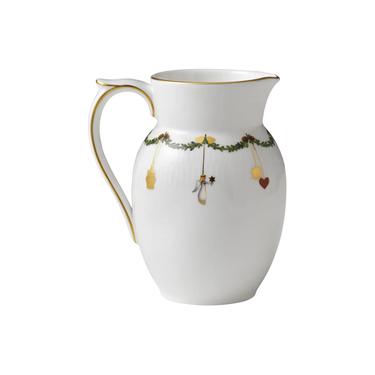 Stjerne Riflet Jul kande i benporcelæn fra Royal Copenhagen. Denne elegante kande på 90 cl fra stellet Stjerne Riflet Jul er en elegant tilføjelse til ethvert julebord. Langs kandens subtile dekoration i relief hænger en fin granguirlande, hvorpå der er hængt julepynt og små grankogler. Kandens elegante hank er ligesom kanten bemalet i guld. Kanden er ideel til kolde som varme drikke.