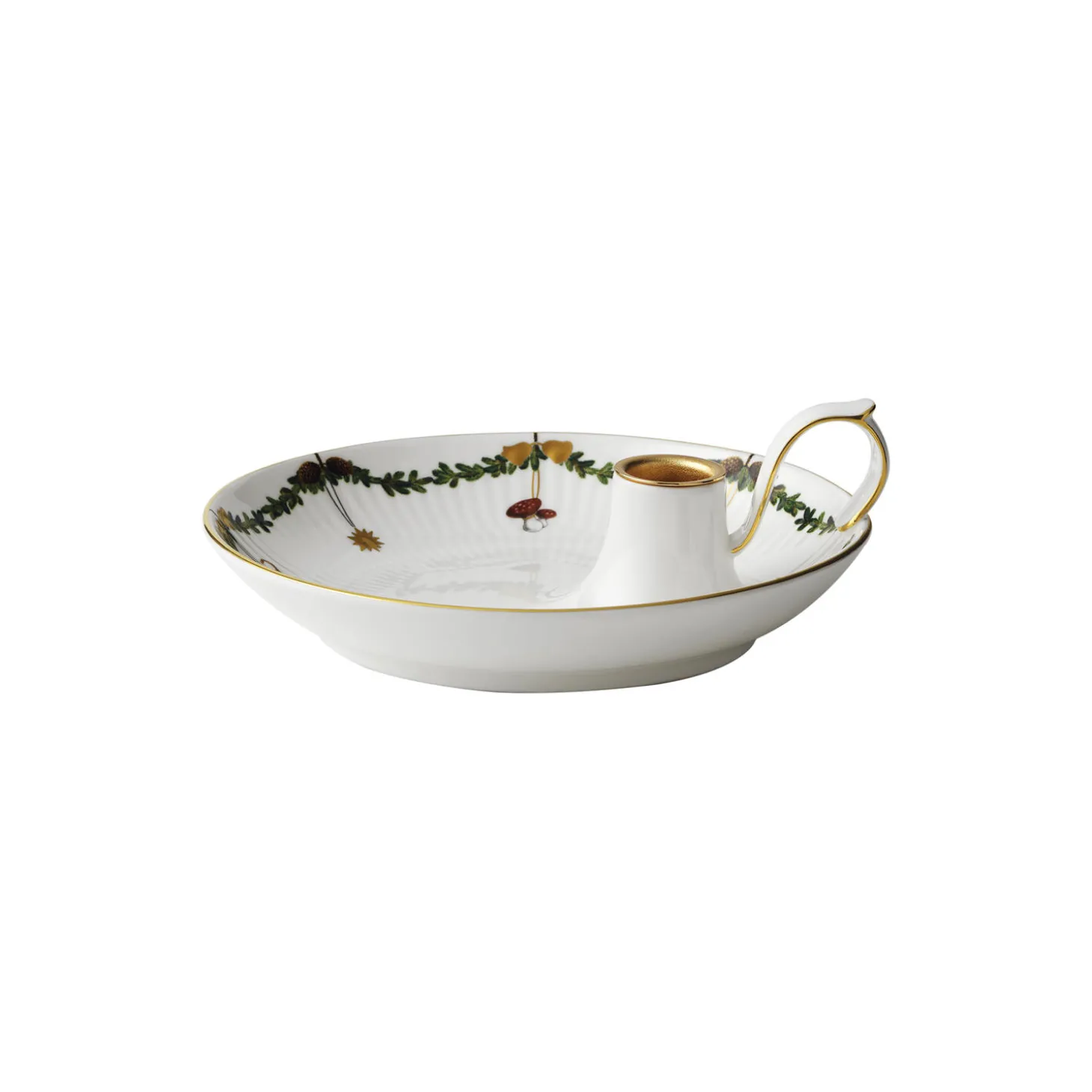 Stjerne Riflet Jul lysestage i benporcelæn fra Royal Copenhagen. Stjerne Riflet Jul Lysestage på 17,5 cm har et klassisk design, der passer perfekt ind i den traditionsrige juletid. Langs kanten hænger en granguirlande, der er pyntet med silkesløjfer og den fineste julepynt, mens kanten og den elegante hank er rørt af guld, der skinner i stearinlysets skær. Sæt lysestagen på spisebordet eller sofabordet og tilføj et smukt skær af julens særlige magi til skattede minder med dine kære.
