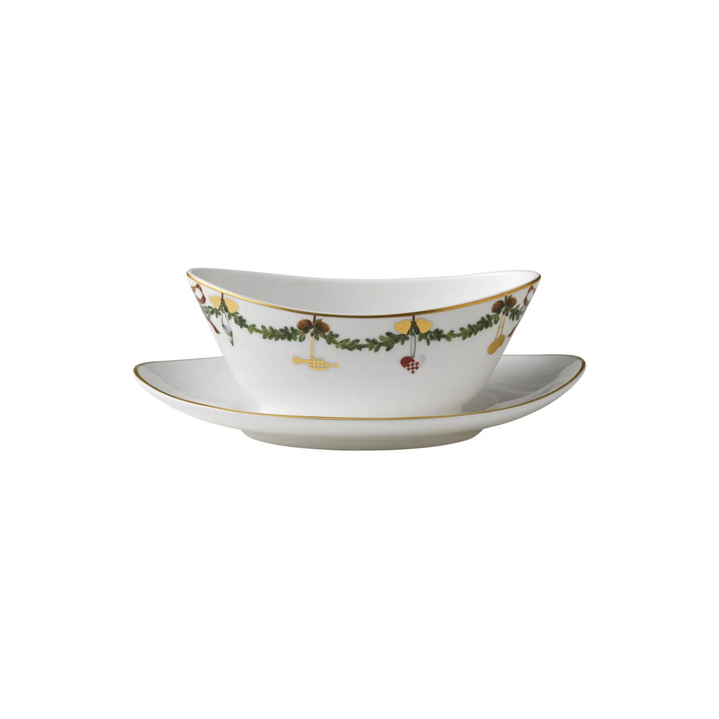 Stjerne Riflet Jul sovseskål i benporcelæn fra Royal Copenhagen. Som et uundværligt element på ethvert dansk julebord er saucebåden i Stjerne Riflet Jul på mange måder indbegrebet af jul. Saucebådens enkle formsprog er udsmykket med gulddetaljer og en granguirlande med julepynt og grankogler, og en rød sløjfe pynte i hver af saucebådens sider. Brug også saucebåden til andre serveringer og snacks.