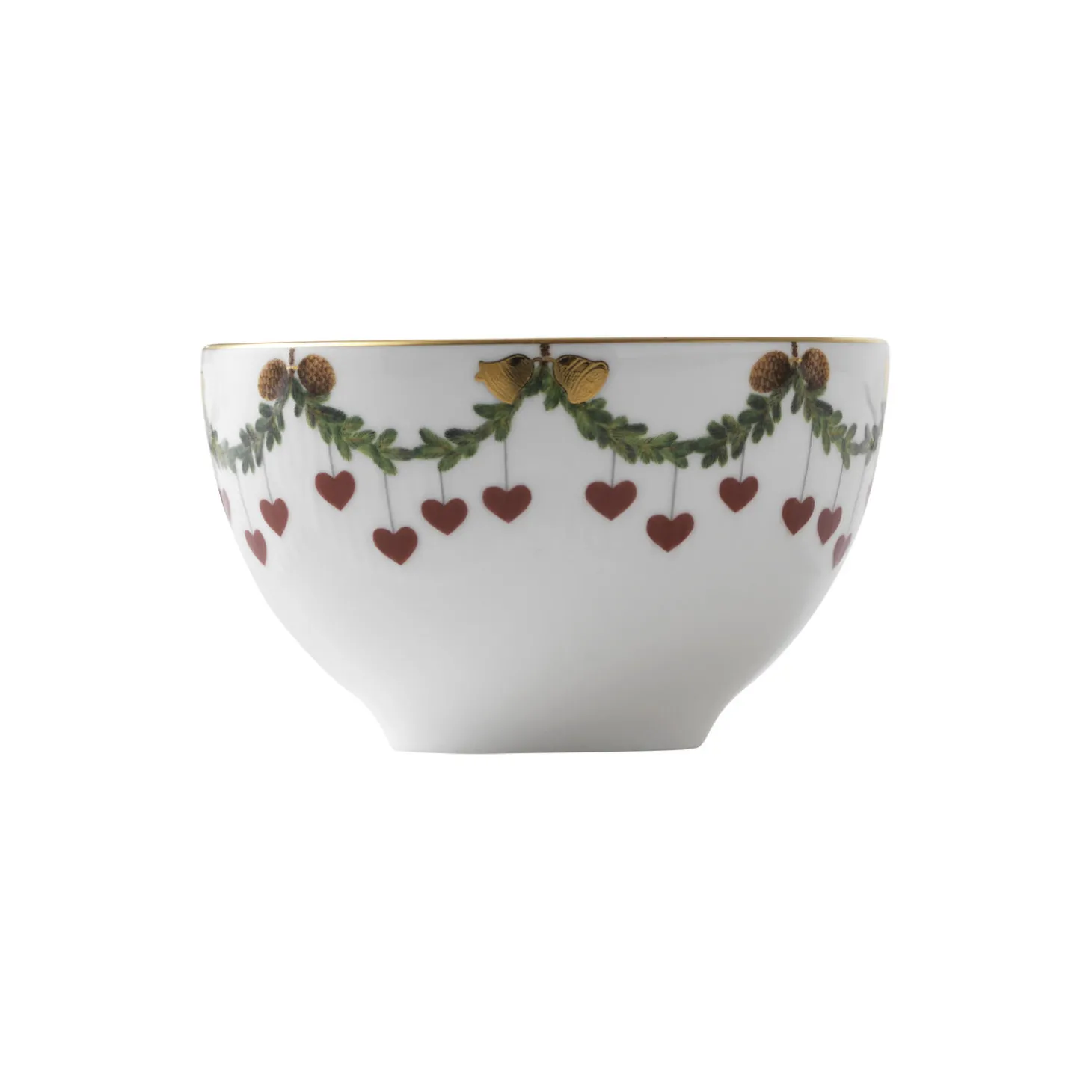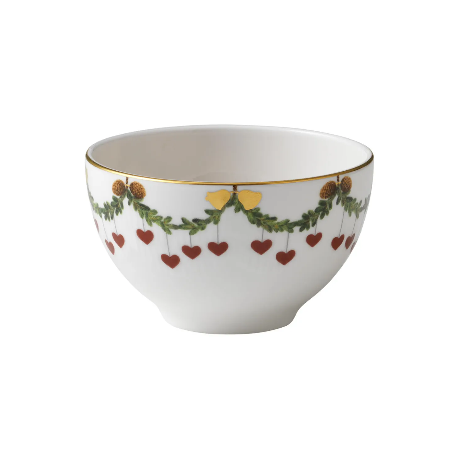 Stjerne Riflet Jul konfektskål i benporcelæn fra Royal Copenhagen. Den charmerende 30 cl skål i Stjerne Riflet Jul er oplagt til kiks og søde sager og er en smuk tilføjelse til alle julens hyggestunder. Skålen er dekoreret med en granguirlande pyntet med grankogler og julehjerter.