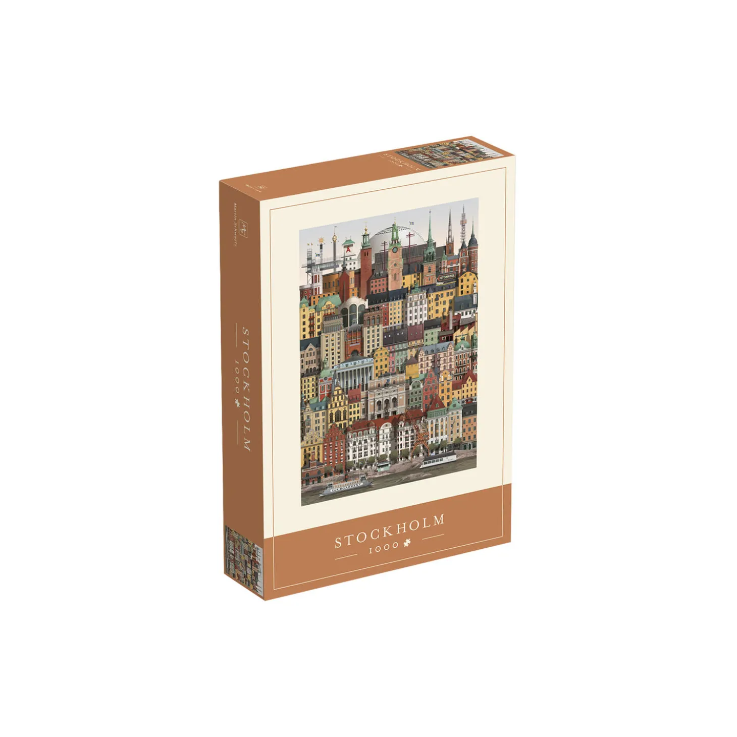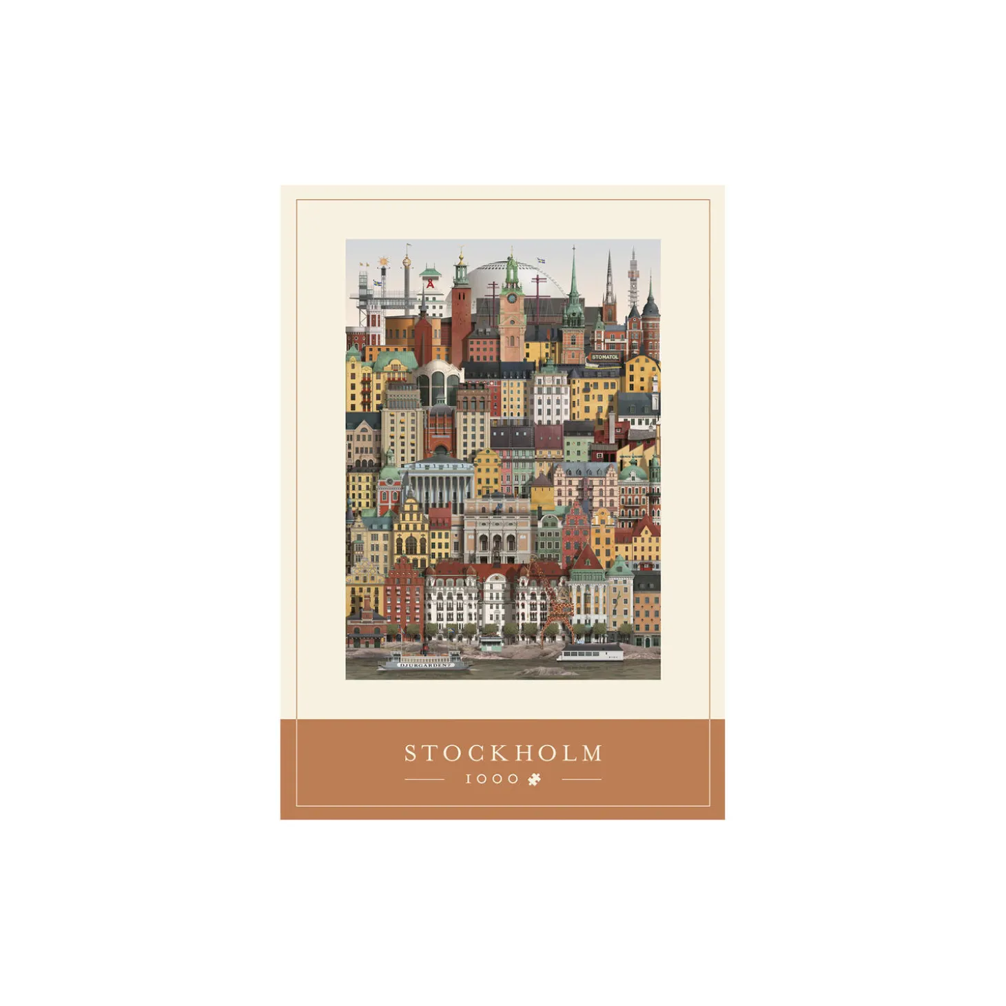 Stockholm puslespil trykt på pap fra Martin Schwartz. Farve: multifarvet. Mål: 50×70 cm. Antal: 1000 brikker.