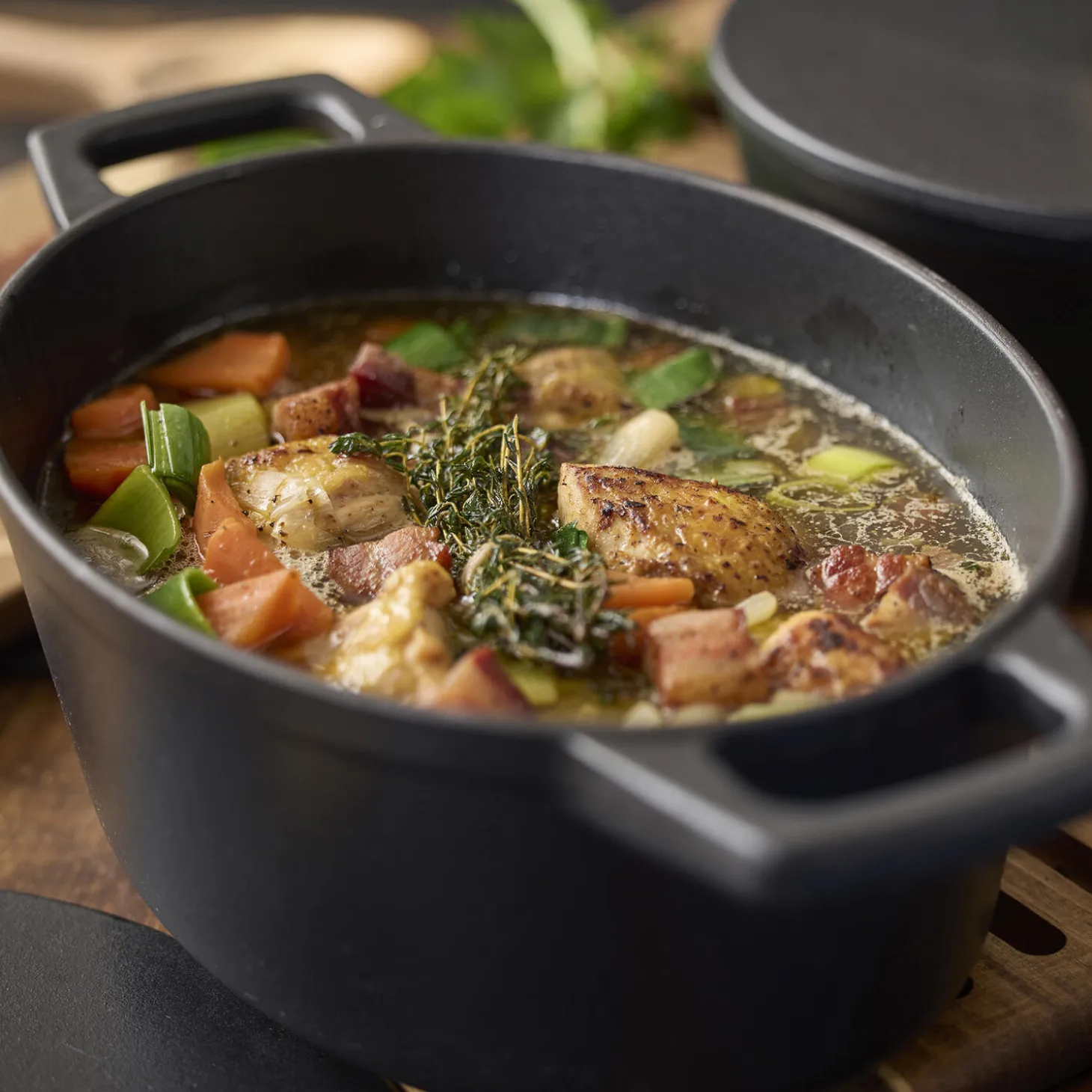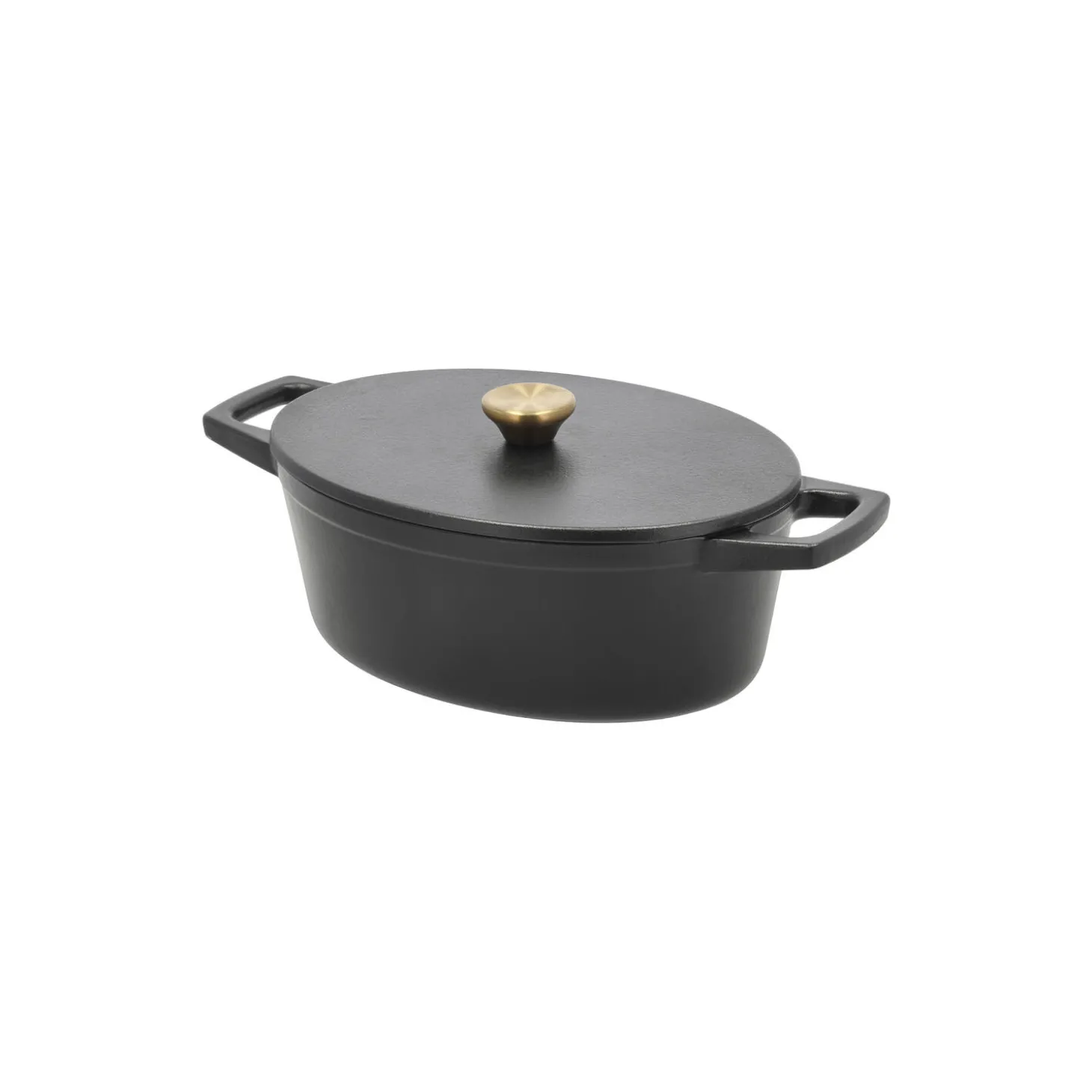 Oval støbejernsgryde, 3,8 liter, med en 3-lags mat sort emaljecoating. Gryden har grædelåg, det vil sige, at et relief på indersiden af låget opfanger den varme damp og lader den dryppe tilbage i gryden og give smag til retten. Støbejern holder godt på varmen og fordeler den jævnt og effektivt. Gryden kan anvendes på alle varmekilder samt i ovn og på grill. Det er vigtigt at løfte gryden, når du skal flytte på den – skub den aldrig frem og tilbage på komfuret, da det kan ridse. Støbejern er ikke egnet til sure fødevarer og må aldrig benyttes til langtidsopbevaring. Redskaber i træ, plast eller silikone anbefales. Håndopvask med varmt vand og opvaskemiddel anbefales, også inden første brug. Sørg for at støbejern er helt tørt, inden det sættes væk, så der ikke dannes rust.