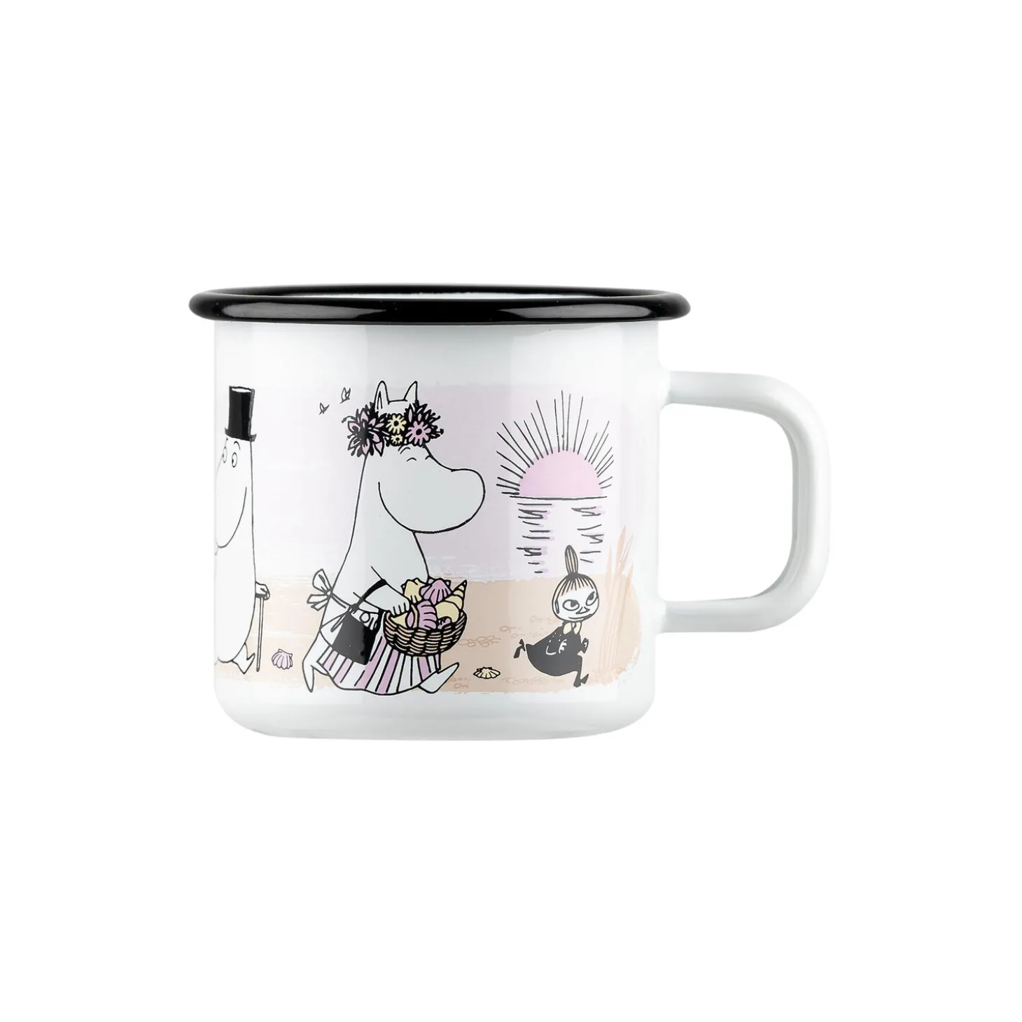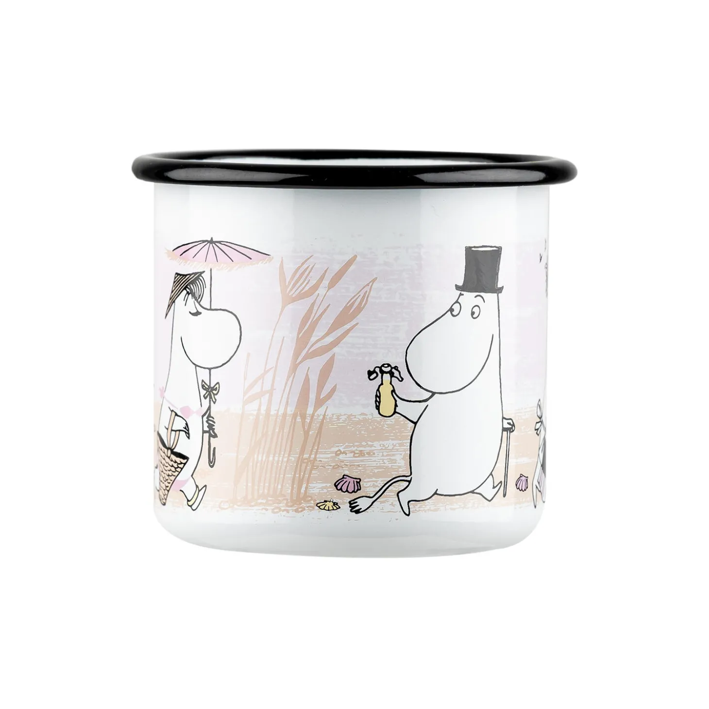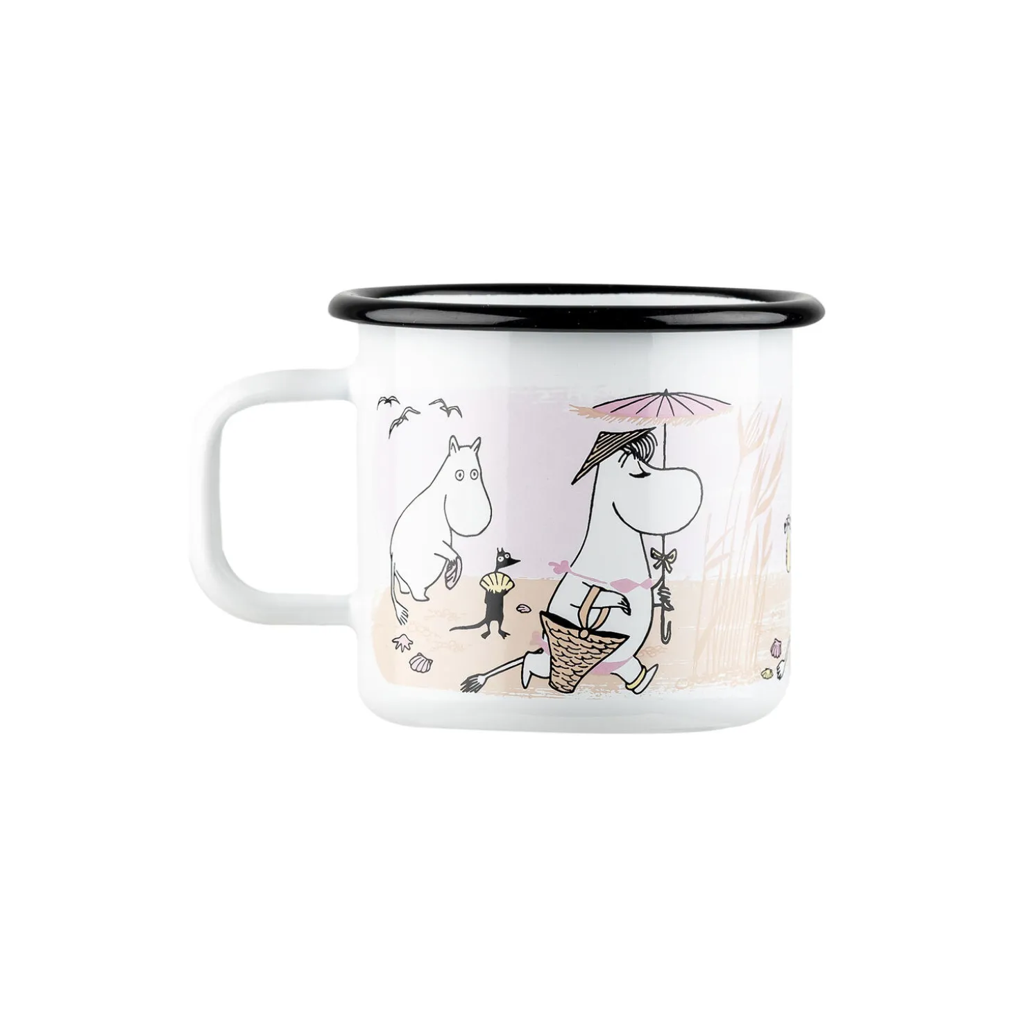 Flot emaljekrus med motiv af mumifamilien, fra Tove Janssons mumitroldene. Emalje kruset er fra serien The Beach. Muurla’s emaljekrus har en blød kant teknik, hvor krusets skarpe kant er bøjet helt indad for at skabe en behagelig overflade at drikke af. Emaljeprodukterne består af en kerne af kulstofstål, der er dobbeltbelagt med emalje af høj kvalitet. Alle Muurla’s emaljeprodukter er opvaskemaskine sikre, men må ikke anvendes i mikrobølgeovne.