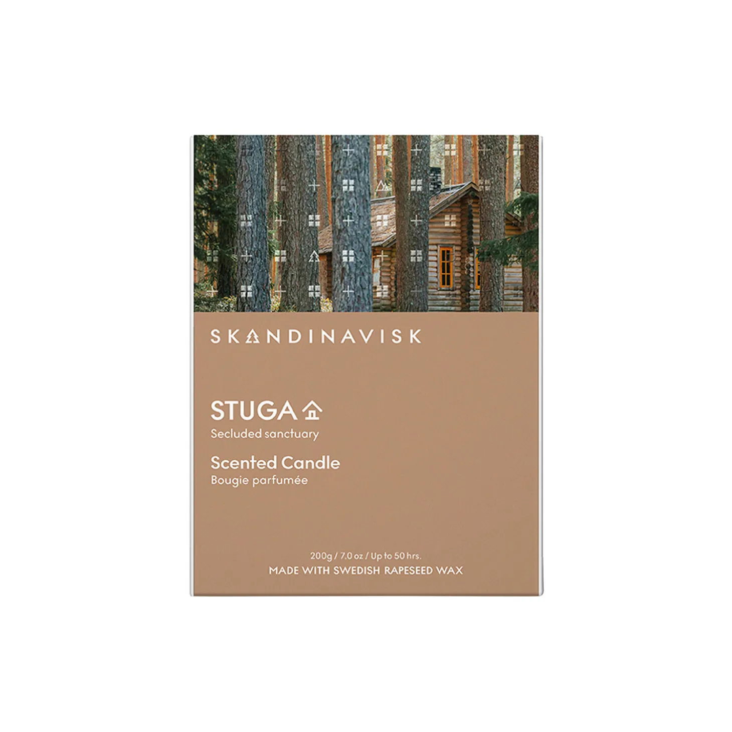 Duftnoter: Birkebark og skovmosser, muskatnød og røgelse. Parfume og svensk rapsvoks blandet i malet glas med en væge af ren bomuld og låg af indgraveret bøgetræ. Emballage fra forvaltede nordiske skove med vandbaserede farvestoffer. 200 g. Op til 50 timer. STUGA – svensk for ‘hytte’. At være omsluttet af en træhytte dybt inde i skoven er at opleve en forbindelse til naturen så ren og rå, at sanserne aldrig har føltes mere levende.