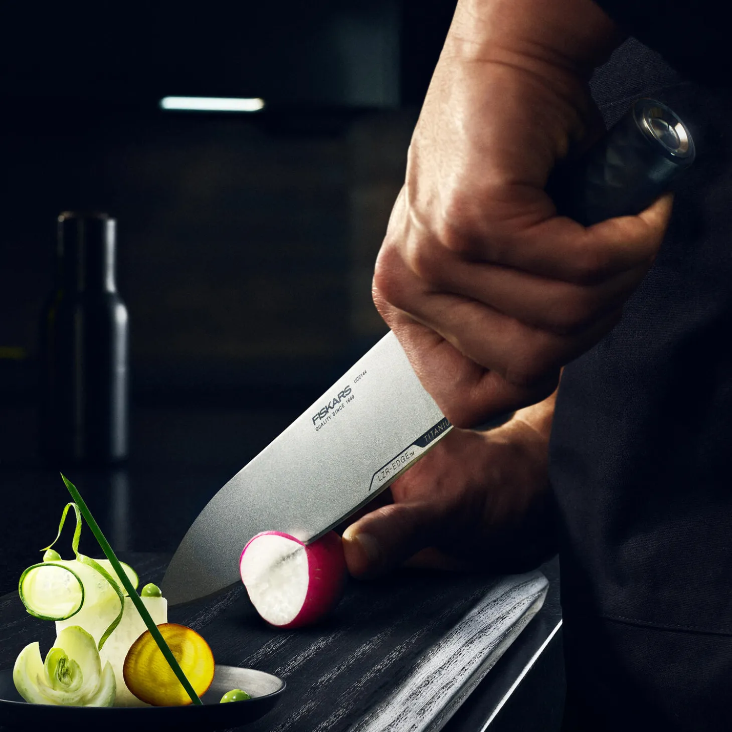Fiskars Taiten er innovative køkkenknive, der slipper fantasien løs og giver fuld kontrol, når du frembringer lækre, kreative retter. Takket være sit titaniumblad er den store Taiten kokkekniv på 20 cm ekstraordinær let med en vægt på blot 107 g. Det gør kniven nem at bruge, og udskæringen af dine råvarer bliver hurtigere og mere præcis. Den revolutionerende LZR-EDGE™-teknologi, hvor partikler af titaniumkarbid bliver påført æggen med laser, holder kniven skarp op til fire gange længere end standardknive. Titanium giver også ultimativ beskyttelse mod rust og forlænger levetiden. Det ergonomisk-designede håndtag med tredimensionelt mønster sørger for et behageligt greb. Knivbryst og endekapsel i rustfrit stål giver en perfekt balance ved brug af mange forskellige skæreteknikker til kød og grøntsager. Vær opmærksom på, at titanium ikke er et magnetisk materiale, så kniven kan ikke opbevares på magnetiske knivholdere som f.eks. en magnetisk knivskinne eller knivblok. På grund af det særlige titaniumblad anbefaler vi kun slibning med slibesten og opvask i hånden, når kniven skal rengøres. Skær aldrig i frosne madvarer eller andre ekstremt hårde ting. 25 års garanti. Designet i Finland.