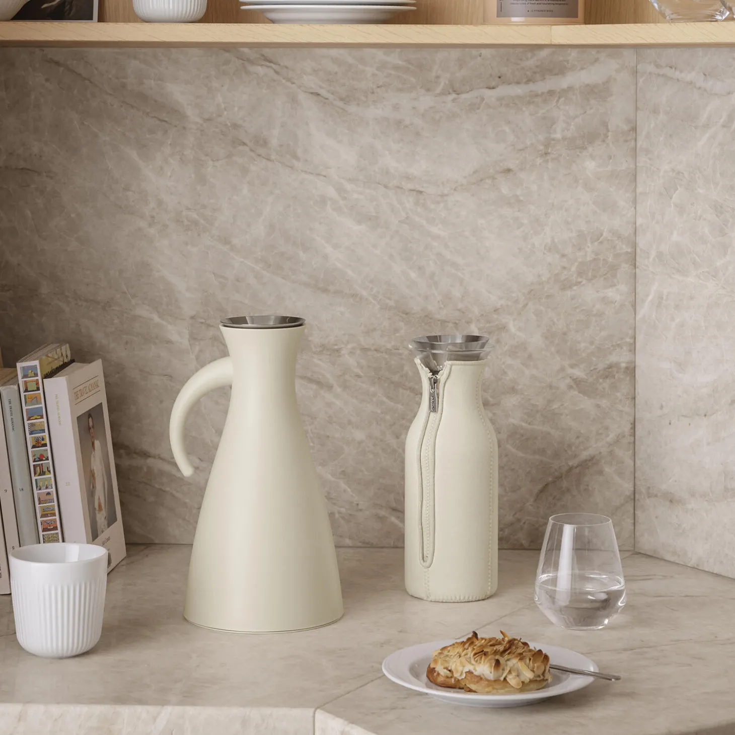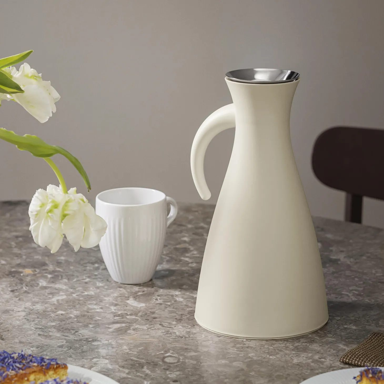 Det skulpturelle design af termokanden bygger på et prisvindende koncept, der med en hældekrave i rustfrit stål sikrer, at kanden er 100% drypfri. Den brede åbning i toppen gør det nemt at fylde kanden, som både kan bruges til varme og kolde drikke. Udvendigt er den lavet af holdbart kunststof, mens den indvendigt har en glaskolbe, som holder drikkevarer varme eller kolde i lang tid. Termokanden er også effektiv til at holde en halv kande varm og holder tæt, selv når den ligger ned.