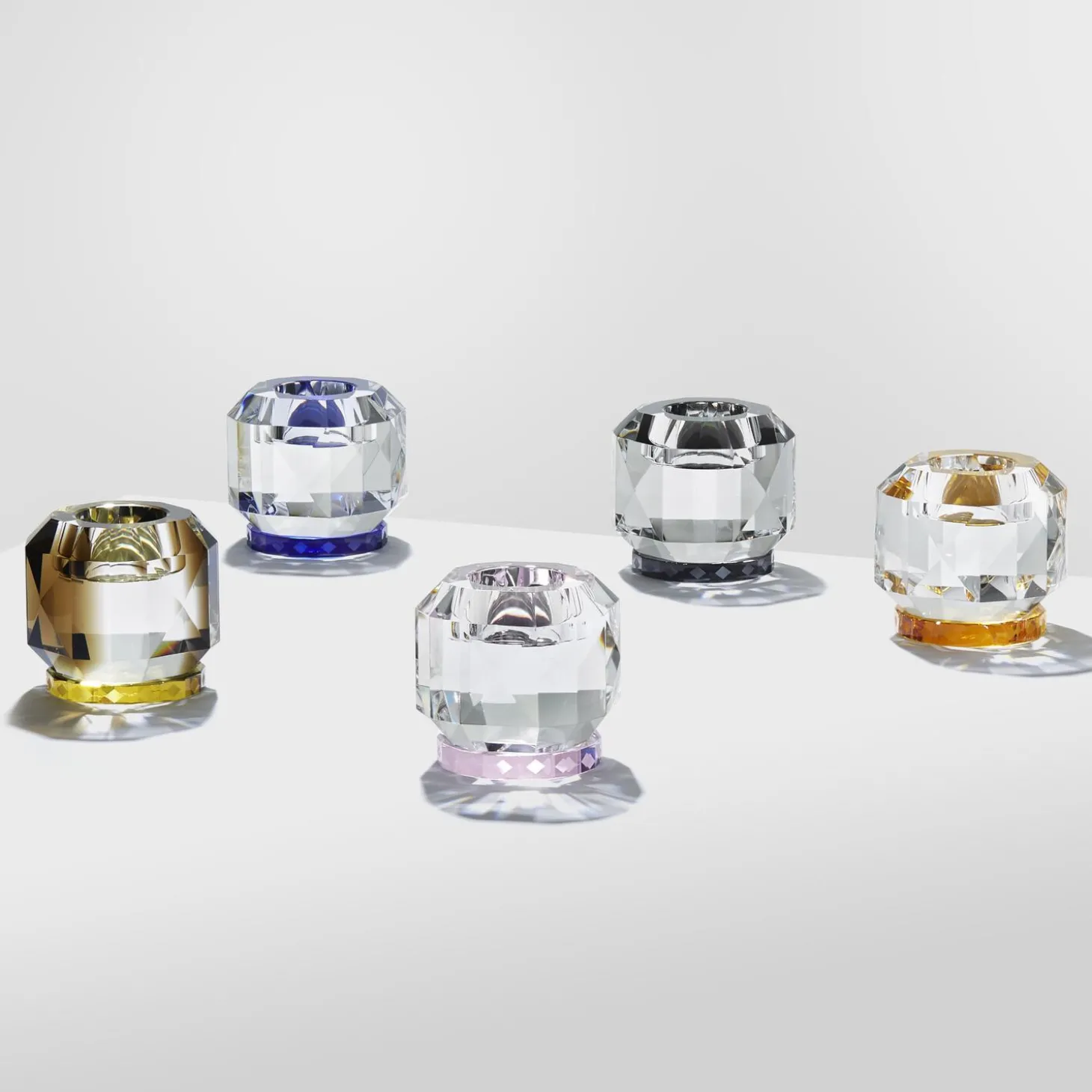 Denne elegante fyrfadsstage kommer i fem forskellige farvekombinationer og er inspireret af 1920’ernes luksuriøse æra. Fyrfadsstagen er lavet ud af ren, håndskåret krystal og formet i geometriske og juvellignende former. Når der tændes lys i fyrfadsstagen, skyder lyset yndefuldt gennem de farvede krystaller og skaber en blød belysning.