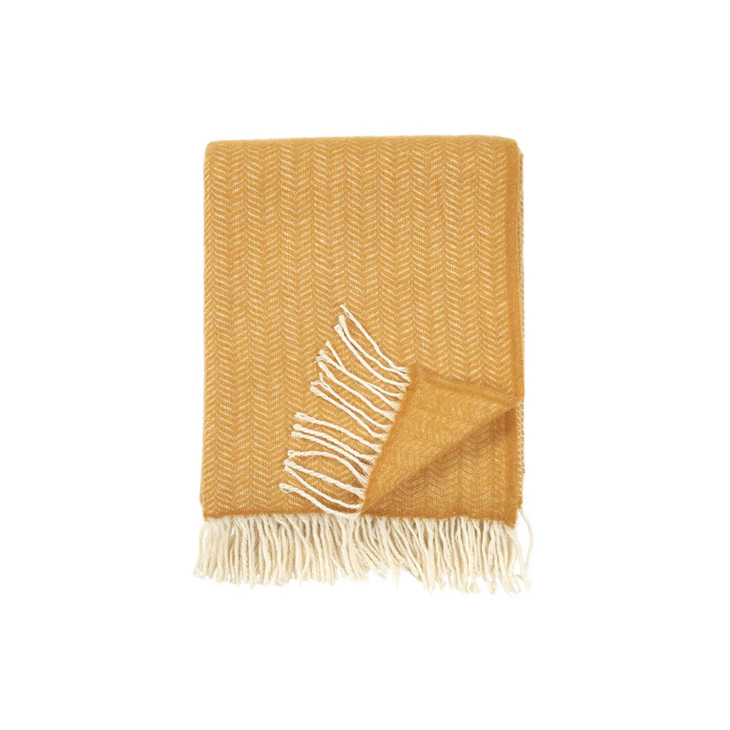 Tippy plaid i 25% kashmir og 75% merino uld fra Klippan Yllefabrik. Farve: mustard. Mål: 180×180 cm. Design: Birgitta Bengtsson Björk.