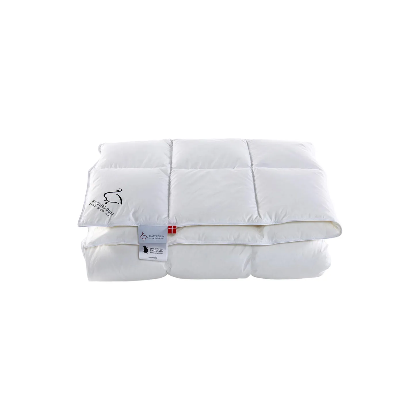 Tommelise lun helårsdyne med gåsedun og vår i 50% lyocell og 50% bomuld fra Ringsted Dun. Farve: hvid. Fyldmængde: 550 g. Bæreevne over 13.