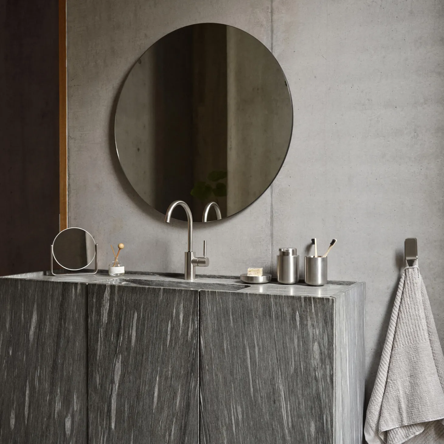 UME-serien har i flere år været et centralt ikon i Zones badkollektion. Nu udkommer serien i et eksklusivt nyt materiale, nemlig mat stål. Et oplagt valg til badeværelser og toiletter alle steder, hvor funktion og æstetik er i højsædet. De bløde organiske former får smukt modspil fra det stilrene og kølige stål i serien, som er skabt i samarbejde med designteamet VE2. I gulvhøjde byder serien på en mindre pedelspand samt toiletbørste i cylinderformet holder. Til væggen er der matchende toiletrulleholder samt kroge i elegant u-form med skjulte beslag. Til bordet findes både sæbedispenser, sæbeskål samt tandbørstekrus samt rundt bordspejl med vippefunktion. På trods af stålets mathed reflekterer lyset sig smukt i overfladen og giver overfladen liv og karaktér. Alt i alt en formfuldendt forvandling af en ægte Zone-klassiker.
