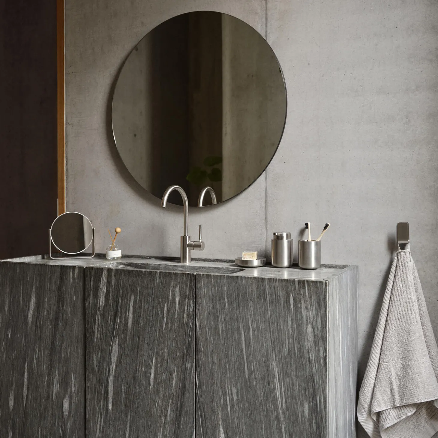 De små vægkroge kan sikkert, men diskret, bære alt fra håndklæderne til badebørsten. De runde hjørner giver krogene et venligt udtryk, og takket være skjulte beslag har de en klædelig lethed på væggen. De er lette at montere, ja faktisk er det sværeste nok at vælge farve. De små skønheder i pulverlakeret aluminium fås nemlig i hele 9 forskellige nuancer samt rustfrit mat stål. UME-serien har i flere år været et centralt ikon i Zones badkollektion. Nu udkommer serien i et eksklusivt nyt materiale, nemlig mat stål. Et oplagt valg til badeværelser og toiletter alle steder, hvor funktion og æstetik er i højsædet. De bløde organiske former får smukt modspil fra det stilrene og kølige stål i serien, som er skabt i samarbejde med designteamet VE2. I gulvhøjde byder serien på en mindre pedelspand samt toiletbørste i cylinderformet holder. Til væggen er der matchende toiletrulleholder samt kroge i elegant u-form med skjulte beslag. Til bordet findes både sæbedispenser, sæbeskål samt tandbørstekrus samt rundt bordspejl med vippefunktion. På trods af stålets mathed reflekterer lyset sig smukt i overfladen og giver overfladen liv og karaktér. Alt i alt en formfuldendt forvandling af en ægte Zone-klassiker.