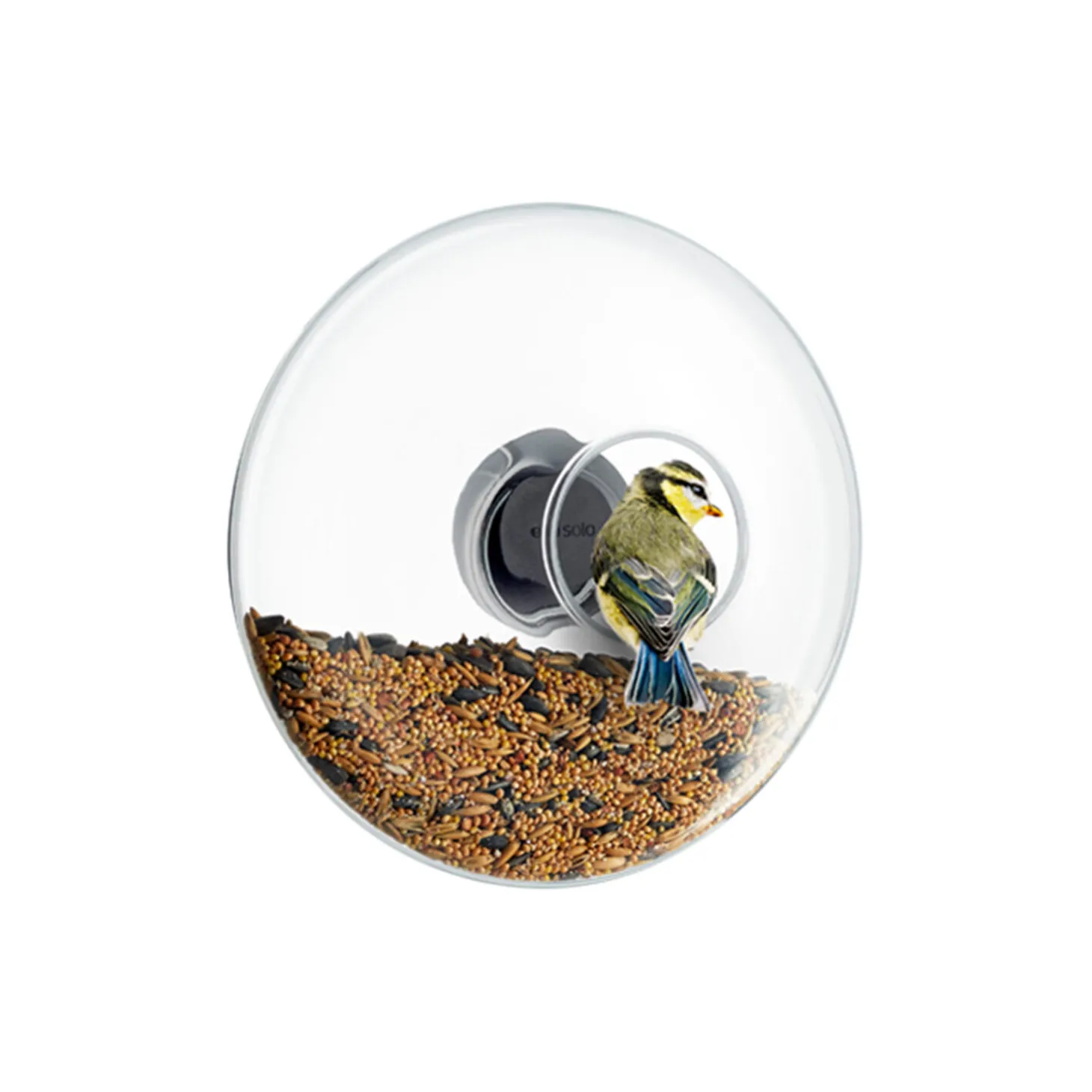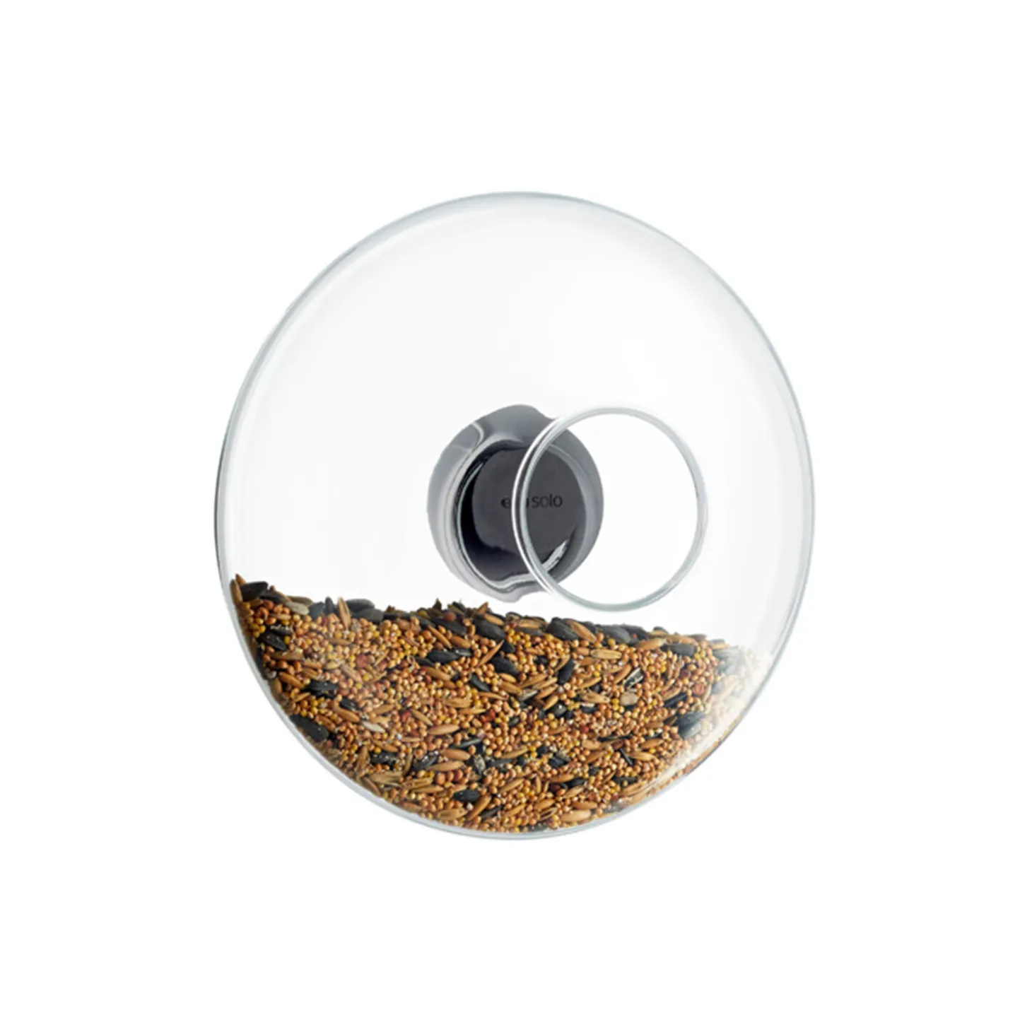 “Kom helt tæt på det mangfoldige fugleliv udenfor vinduet. Eva Solo Fuglefoderkugle er af glas og monteres direkte på ruden. Foderkuglens åbning gør det nemt for småfuglene at sætte sig på glaskanten og spise. Imens giver den gennemsigtige kugle rig mulighed for at studere de forskellige fuglearter på helt tæt hold.Foderkuglen monteres via dobbeltklæbende tape på ydersiden af vinduet, hvor den syner diskret og elegant. Frø hældes i kuglen via hullet og kan rumme op til 90 ml. Ved rengøring fjernes glasset nemt. Glasset er frostsikret, og foderkuglen tåler alle årstider.”