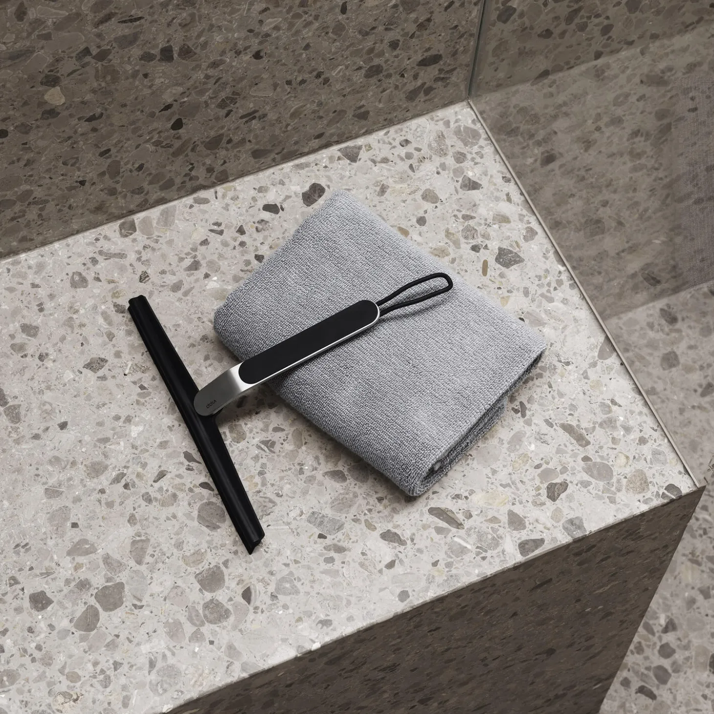 Vipp bruseskraberen har et udskifteligt blad, som let fjerner vand fra glatte overflader på badeværelset. Bløde kanter beskytter overflader, og en gummistrop gør det nemt at hænge bruseskraberen op på den medfølgende krog efter brug.