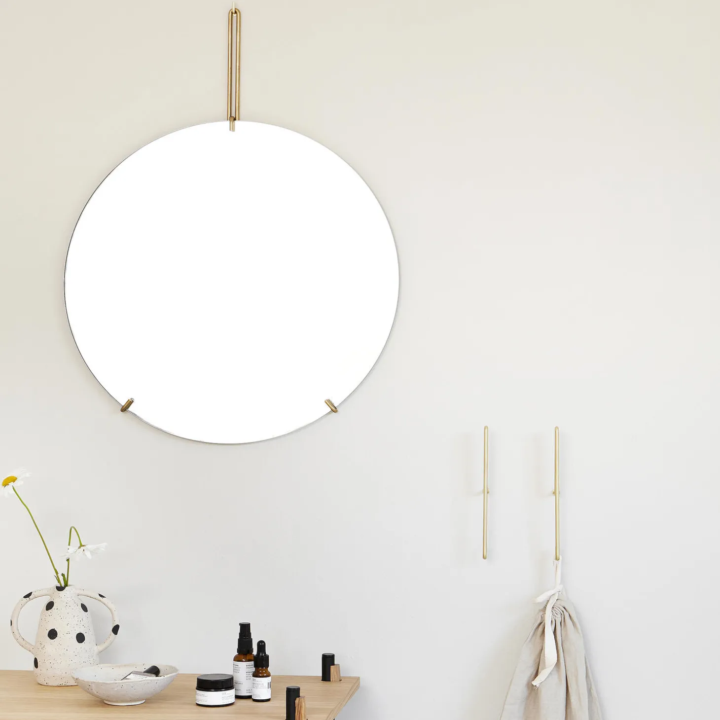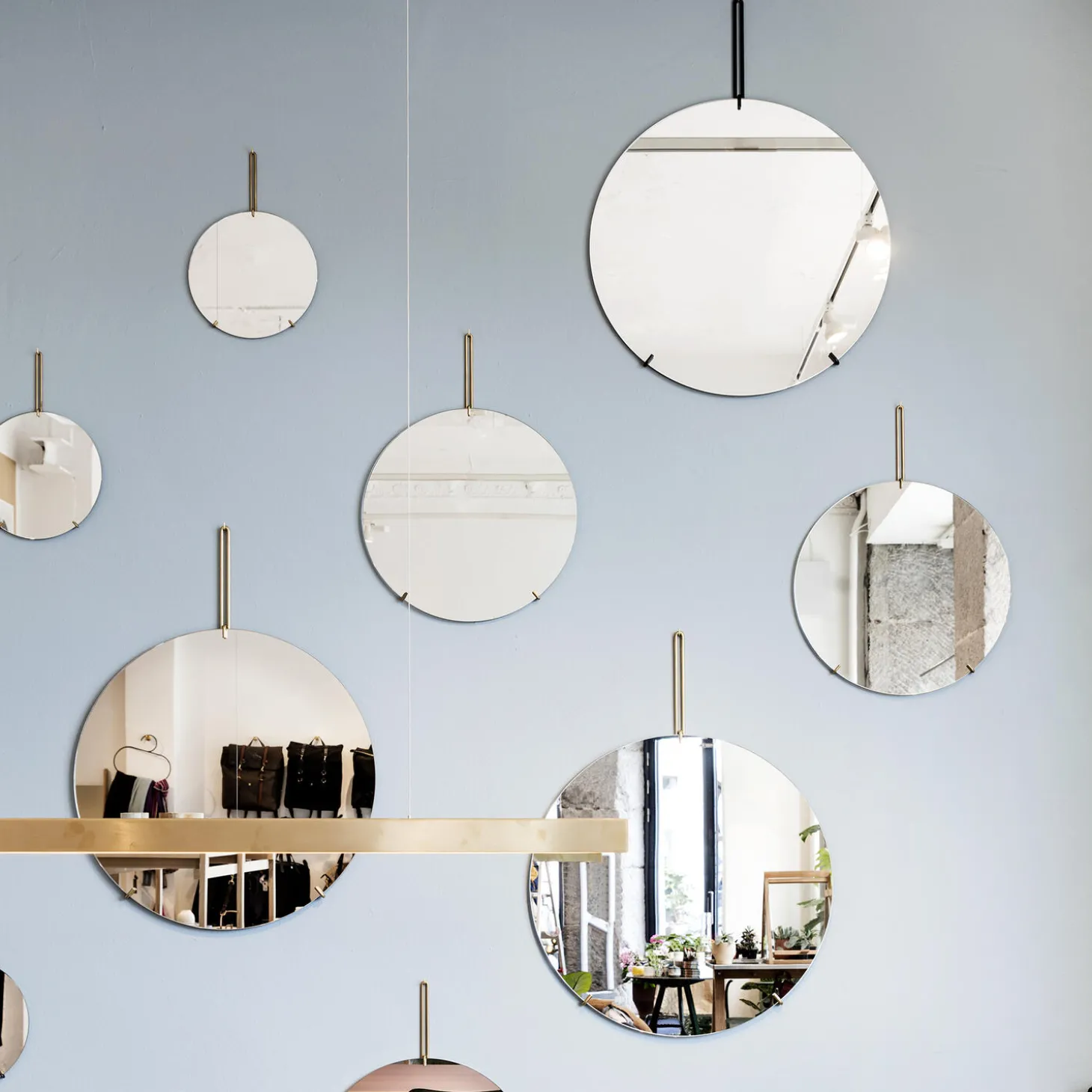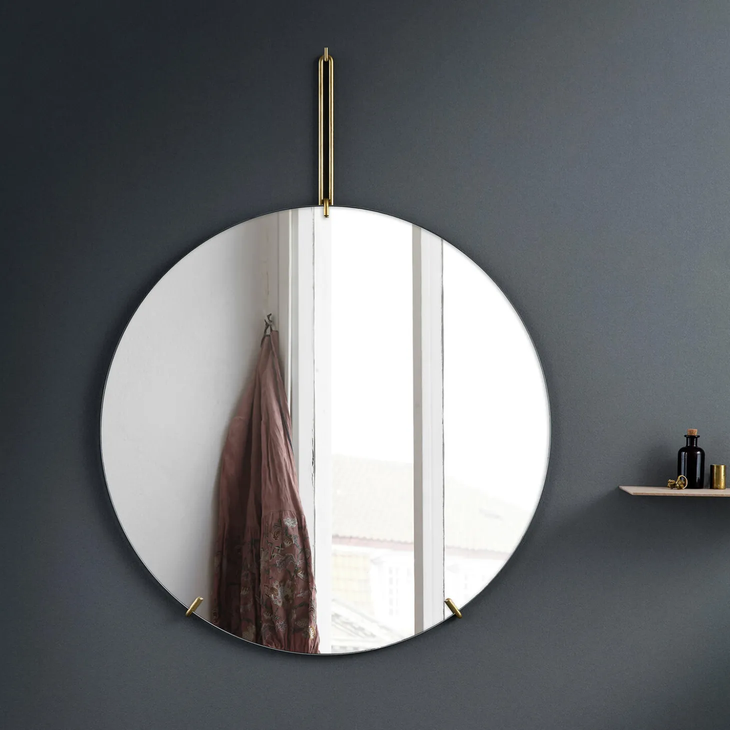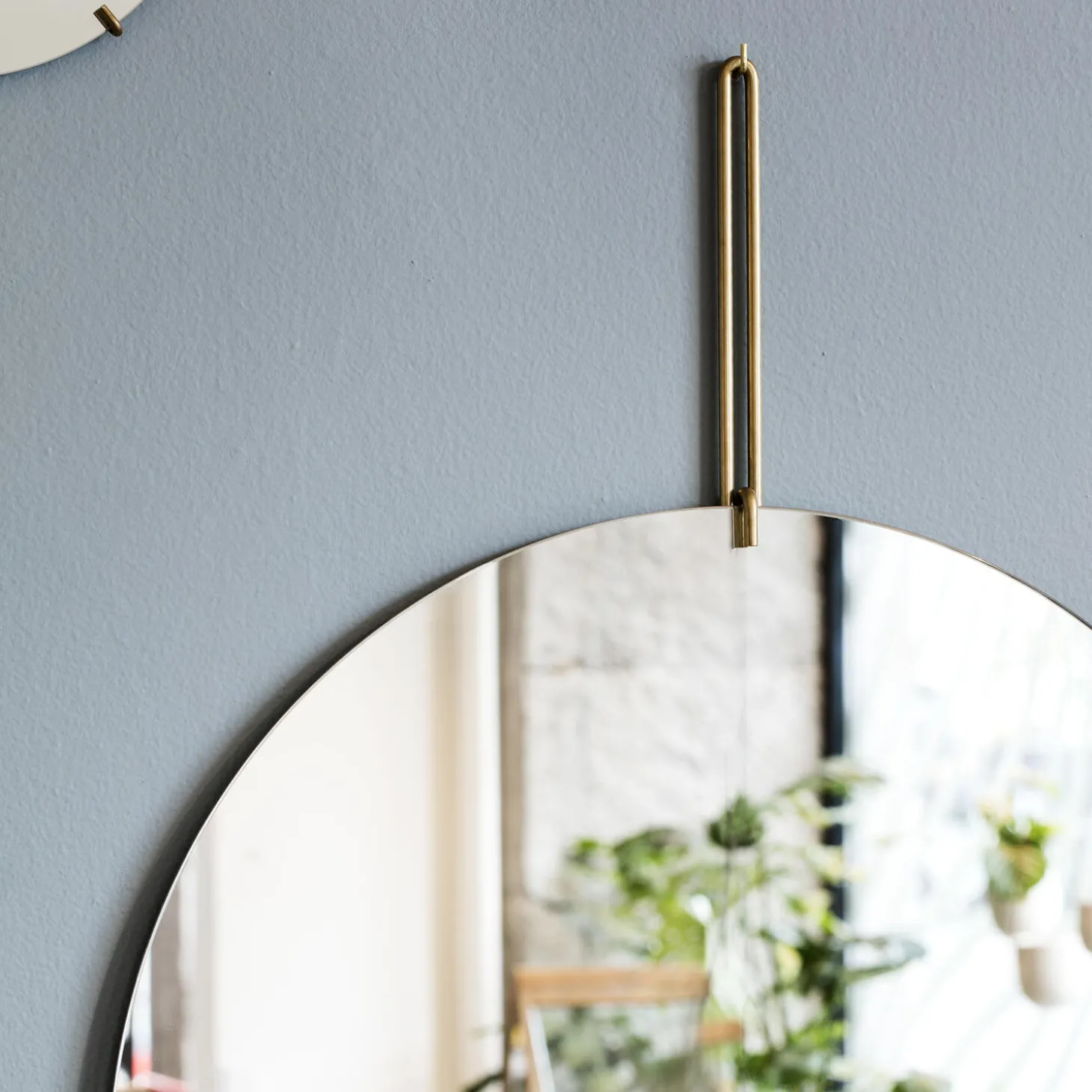 Wall Mirror is designed to sit on your wall with as as little nonsense as possible. Formed from a single piece of mirror glass held by a lightweight metal wireform. The mirror is hung from a simple L hook mounted to the wall.