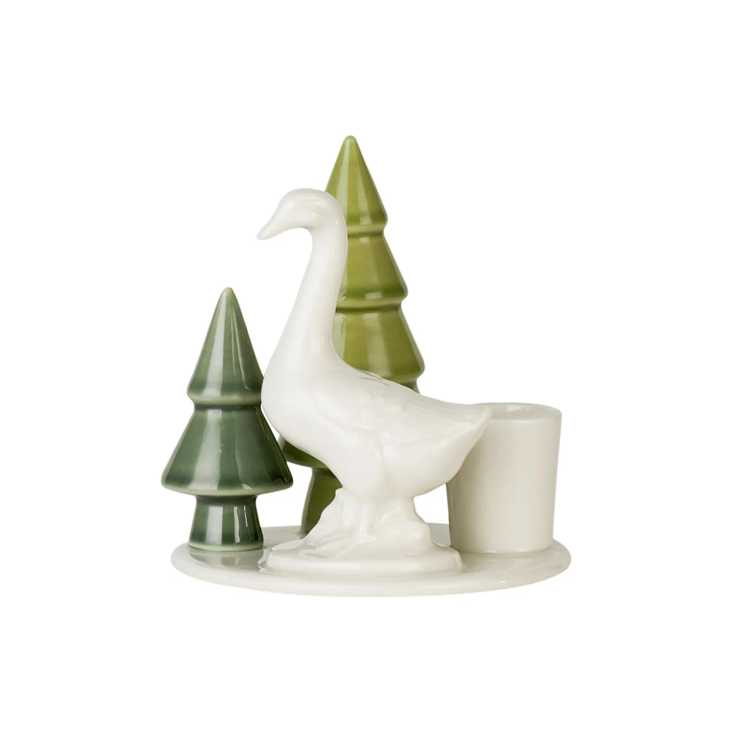 Lysestage med gås. Gåsen er et klassisk julemotiv i Danmark – her med to træer. Winter Stories er små magiske fortællinger om nordens særlige lys og landskab. De bringer varme og hygge til de mørke vinterdage. Beregnet til kronelys.