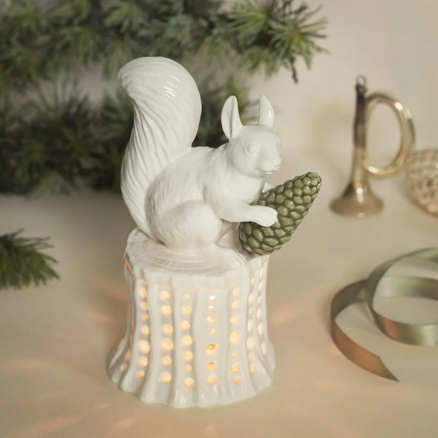 Fyrfadsstage med et egern på træstub. Egernet sidder på en træstub med en kogle i hånden. Lyset skinner ud gennem hullerne og kaster smukke skygger på bordet, når mørket falder på.